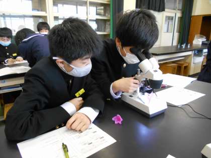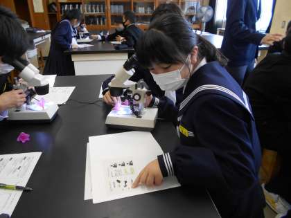 理科の実験で、前庭に咲いていたつつじの観察をしています。前回、習った顕微鏡の使い方を確認しながら、つつじの作りをじっくり見ています。うまくピントを合わせられるかな?