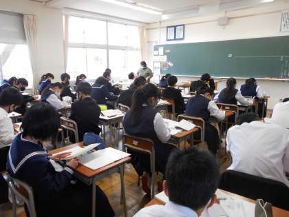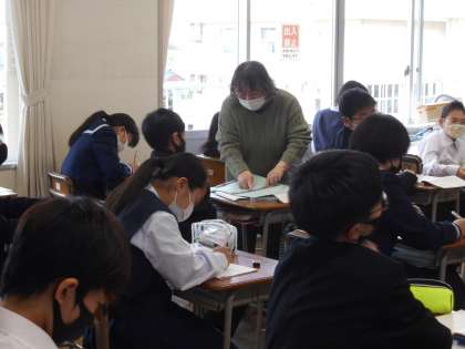 授業風景1年4組 公開日 2021/05/07 更新日 2021/05/07 山室中学校のページ 5月7日(金) 国語では「シンシュン」の物語文の学習をしています。各自黙読して、気になる表現や感想をノートにまとめています。