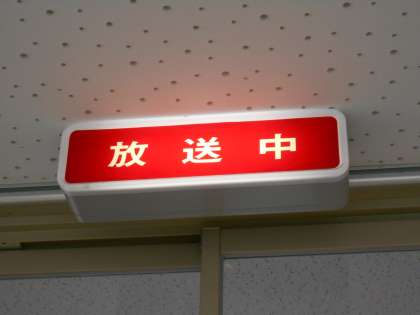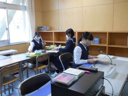 お昼の放送室は、委員会のお知らせのため、生徒で賑わっています。厚生委員長から配膳の準備が早かったクラスを発表しています。