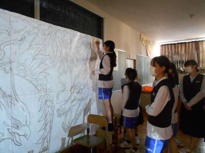 技術室では暗闇の中で・・・美術部が活動中!体育大会のデコレーション製作です。プロジェクターで下絵を拡大して映していました。間近で見るとすごい迫力です。できあがりが今から楽しみですね。
