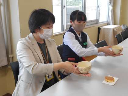 茶道部に招いていただき・・・ 公開日 2021/05/12 更新日 2021/05/12 山室中学校のページ 5月12日(水) 今日は茶道部に招いていただき、お抹茶をいただきました。甘いおいしいお菓子に、ほんのり苦みがあるお茶が合います!そして茶道部の先生方と茶道部の皆さんとの会話にほっこり癒やされてきました。茶道の作法も部員の皆さんが丁寧に教えてくれました。