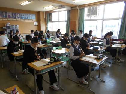 授業風景その1 公開日 2021/05/13 更新日 2021/05/13 山室中学校のページ 5月13日(木) 【2−6:音楽】 アルトリコーダーの美しい音色が響きます。 【2−4:英語】 アビゲイル先生とスピーチテストをしています。