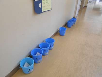 給食前の配膳室では、寺西さん、大野さんが給食室の台ふき用のバケツの準備、ワゴンをセットし、各階にエレベーターで運んでおられます。いつもありがとうございます!
