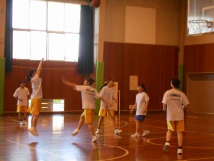 体育館では、女子バスケットボール部がコート一面を使って走っています。コーチに自分たちで取り組みたいメニューを提案するなど、やる気がみなぎっています。