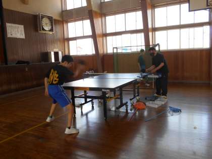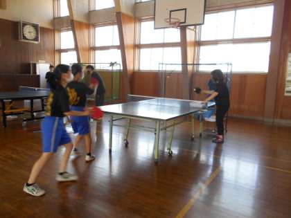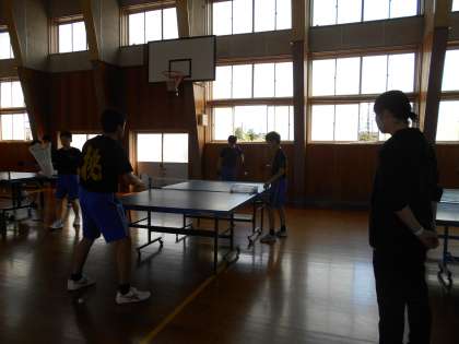休日の部活動その2 公開日 2021/05/15 更新日 2021/05/15 山室中学校のページ 5月15日(土) 第2体育館では、卓球部が活動しています。コーチのお二人に球出しをしていただき、力強くスマッシュを打ち込みます。「いいよ!いいよ!」とコーチの励ましを受けながら、頑張っています。