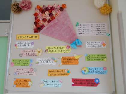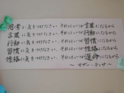 ちょっと立ち止まって 公開日 2021/05/15 更新日 2021/05/15 山室中学校のページ 5月15日(土) 山室中学校の相談室前にこんな掲示があるのを知っていますか?たくさんの手作りの折り紙や言葉の贈り物があります。たまにはちょっと立ち止まって眺めてみてください。 たくさんある言葉の中から、今日はマザーテレサの言葉がグッときました。みなさんはどの言葉が好きですか?