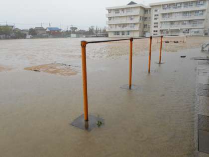 今朝は登校時に激しい雨が降っていました。グラウンドのあちこちに水たまりがあります。玄関が開くまで生徒もしばし雨宿りです。