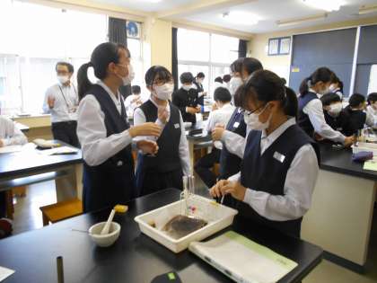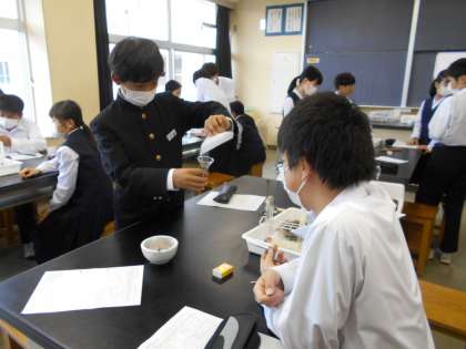 授業風景その3 公開日 2021/05/17 更新日 2021/05/17 山室中学校のページ 5月17日(月) 硫黄と鉄を熱する実験です。ガスバーナーの使い方、加熱方法等を班でしっかり確かめながら楽しく実験しています。
