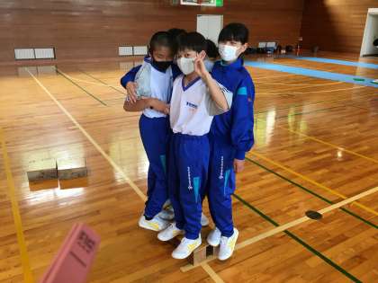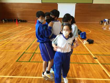1年校外学習その13 公開日 2021/05/19 更新日 2021/05/19 山室中学校のページ 14時半 (日本列島) 日本列島に見立てた台に、班員全員が乗ります。10秒保てるかな?おんぶをしたり片足で立ったり、アイディアに驚かされます。