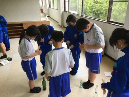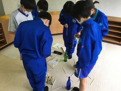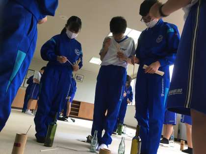 1年校外学習その15 公開日 2021/05/19 更新日 2021/05/19 山室中学校のページ 14時45分 (割り箸ダーツ) 瓶を床に置いて割り箸が入った本数を競います。瓶を置く位置や本数を工夫して作戦を練ります。