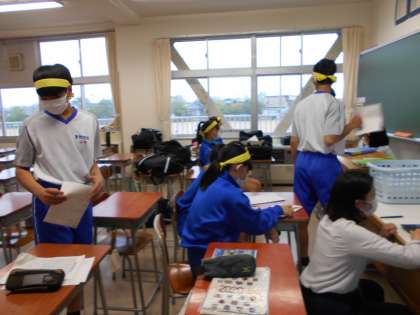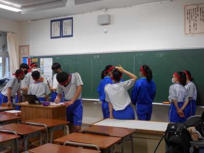 体育大会の団リーダー活動の3日目です。どの団も、具体的な動きの作戦を練っていました。太鼓担当の生徒は、机に段ボールを敷いて、リズムに合わせてたたく練習も始めていました。