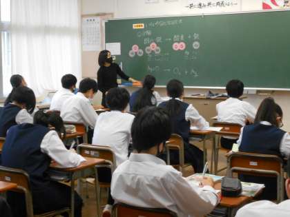 授業風景その3 公開日 2021/05/21 更新日 2021/05/21 山室中学校のページ 5月21日(金) 【2年1組:理科】 化学反応式をモデルを使って学んでいます。ノートにもきれいに化学反応式を書いています。