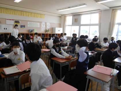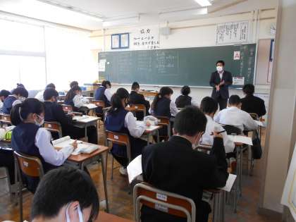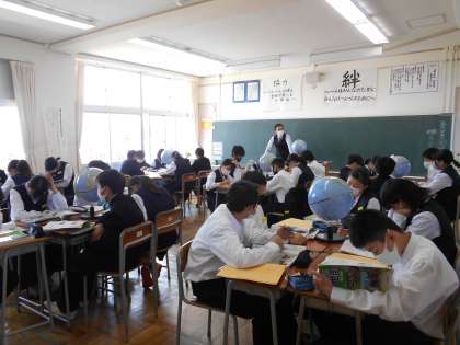 1年 授業風景 公開日 2021/05/25 更新日 2021/05/25 山室中学校のページ 5月25日(火) 【1年3組:英語】 ユニット3の文章を暗唱中!ペアで繰り返すことでだんだん覚えてきました。 【1年4組:数学】 乗法の計算です。符号の組み合わせによって、プラスマイナスが変わります。「今日はたくさんこの符号を使って練習しよう!」 【1年5組:社会】 地球儀を前に、緯度、経度が異なると時差が生じることを実感しながら学習しています。
