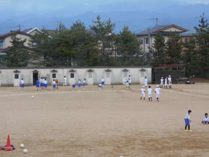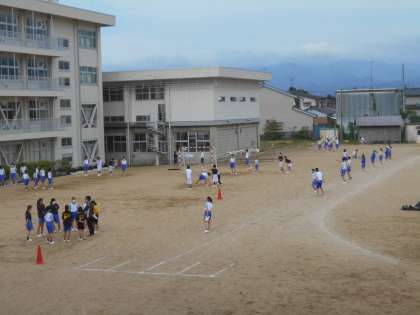 放課後のグラウンドの様子です。体育大会に向けて練習する団リーダーと、来月の大会に向けて練習に励む運動部がスペースを分け合いながら活動しています。明日、結団式が行われ、体育大会に向けての活動もいよいよ本格化します。お聞かせすることはできませんが、ダンスの曲や太鼓の音も鳴り響いています。