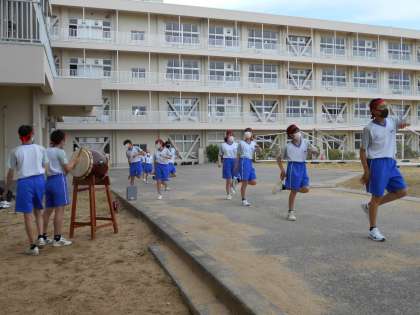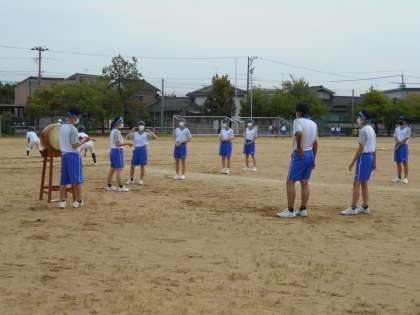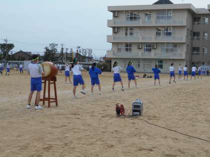 団リーダー活動が始まって、4日目。団リーダーは今日からグラウンドに出て、太鼓に合わせて団演技の練習を始めました。