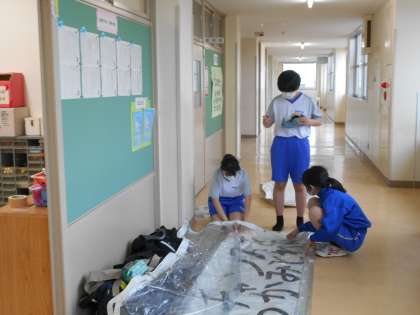 縁の下の力持ち〜体育大会実行委員編〜 公開日 2021/05/26 更新日 2021/05/26 山室中学校のページ 5月26日(水) 放課後の生徒会室前では、体育大会実行委員がスローガンを作成中です。汚れや雨に備えて、ビニールでカバーを付けています。