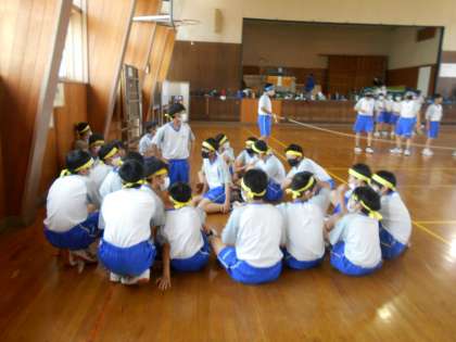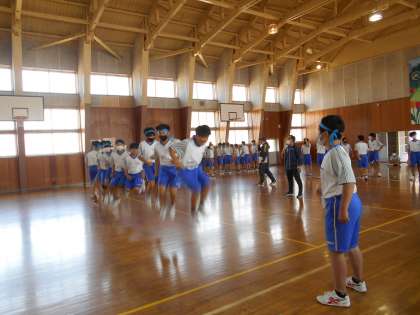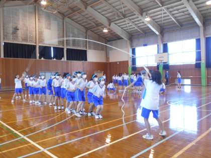2年生は男女に分かれて長縄飛びの練習です。だんだん息が合ってきました。作戦タイムを経て再び跳びます。