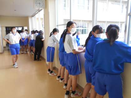 放課後の3階から1階をのぞき込む美術部のみなさん・・目線の先には、完成したデコレーションが!遠く離れて見て、最終チェックです。美術部の皆さん、本当によく頑張っていましたね。見事な出来映えです。当日の披露まで、しばらくお待ちください。お楽しみに!