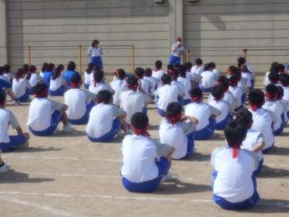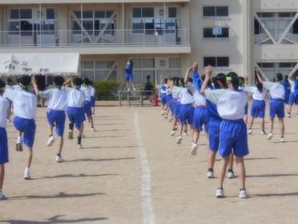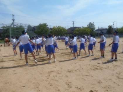 写真中:男女別学年別の小集団で練習していました。3年生が1年生に教えていました。