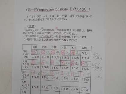 3年廊下には、3学年協議会が取り組んでいる、「preparation for study」の記録が掲示されています。授業準備は整っているか、私語はないか、2分前着席等、学年として重点的に取り組みたいことをクラス対抗で競います。しっかり習慣化できたかな?取り組みが終わっても、意識して続けていきましょう!