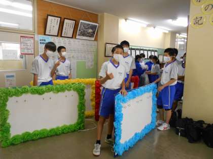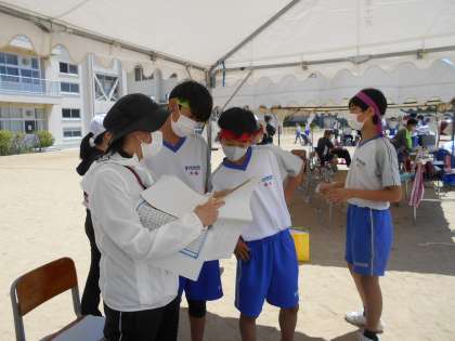 採点掲示係は朝から準備しています。記録係からの用紙を集約して、各団の得点を計算します。