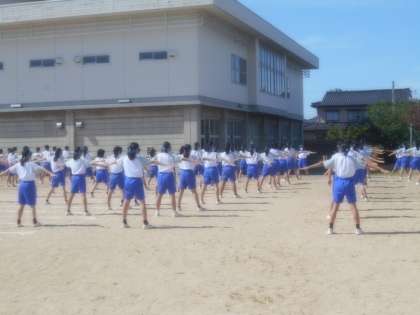体育大会団活動1 公開日 2021/06/02 更新日 2021/06/02 山室中学校のページ 6月1日(火) 午前中の体育大会予行に引き続き、午後は団演技の練習をしました。あさっての本番に向けてますます練習に力が入ってきました。 写真上:狭いところでも整然と練習しています。 写真中:お天気がよく、グラウンドは乾燥気味です。 移動すると砂が舞います。 写真下:こまめに給水しています。 明日以降も多めに持ってきた方がよいですね。