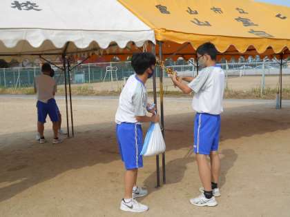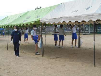 体育大会前日〜今朝の準備〜 公開日 2021/06/02 更新日 2021/06/02 山室中学校のページ 6月2日(水) 今日も3年生団リーダー達がテントを立てています。今日は暑くなりそうです!テントの陰で休憩を適宜取りながら過ごします。