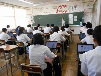 授業風景〜2年生〜 公開日 2021/06/11 更新日 2021/06/11 山室中学校のページ 6月11日(金) 【2年1組:技術】 生物育成に関するレポートを作成するため、クロームブックを使って調べています。 【2年5、6組:体育】 男子は体育館でサッカーの試合をしています。盛り上がっています!