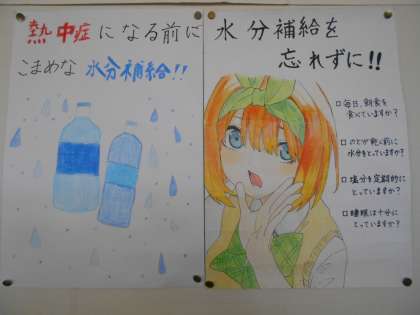 暑い日が続いています。今日は日中30度近くになる予報も出ています。廊下には熱中症予防を呼びかける保健委員会のポスターが掲示されています。コロナウィルスの予防も含めて、健康管理をしっかりしていきましょう!