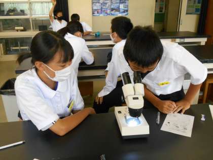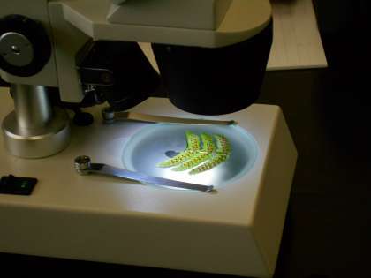 シダ植物の胞子嚢を顕微鏡で観察しています。胞子嚢がはっきり見えて感嘆の声があがっています。