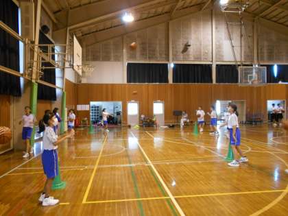 男女バスケットボール部は、様々な角度からシュート練習をしています。男子は自主練習中です。