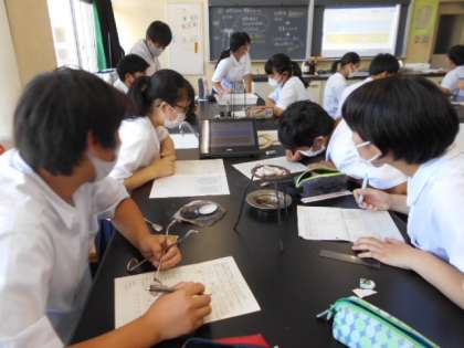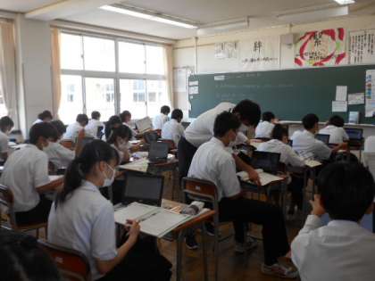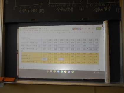 互見授業WEEK〜クロームブックの活用〜 公開日 2021/06/17 更新日 2021/06/17 山室中学校のページ 6月17日(木) 【2年4組:英語】 英語の本文、単語、英訳等をクロームブックを使って各自調べています。 【2年5組:理科】 金属の加熱による質量の変化の実験結果をクロームブックを使ってまとめています。一度に多くのデータを得ることができ、そのデータをもとにグラフを作成しました。