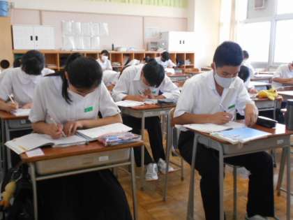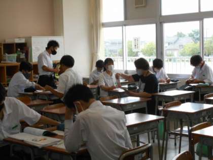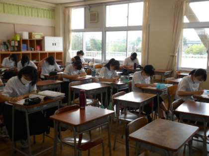 午前中登校生徒〜3年生〜 公開日 2021/06/18 更新日 2021/06/18 山室中学校のページ 6月18日(金) 今日は午前中、各学年A、Bグループに分けての登校になりました。わずかな登校時間ですが、各生徒は第1回の定期テストに向けてこつこつと自主学習を進めています。 3年生はグループで教え合ったり、先生に質問したりしています。