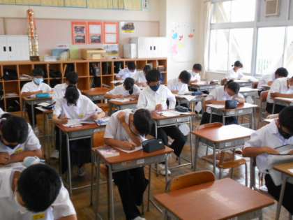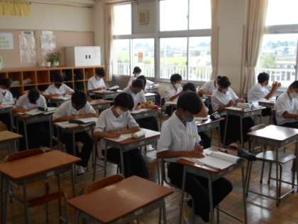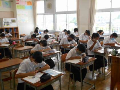 午前中登校生徒〜1年生〜 公開日 2021/06/18 更新日 2021/06/18 山室中学校のページ 6月18日(金) 1年生も、集中して課題を仕上げるべく、頑張っています。今日の午後、土日も上手く活用して、学習を進めていきましょう!