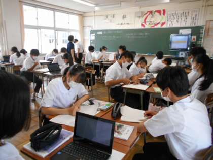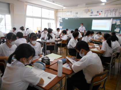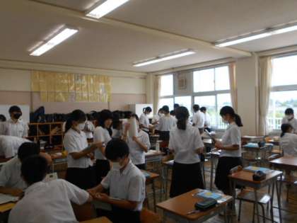 授業風景2年生 公開日 2021/06/23 更新日 2021/06/23 山室中学校のページ 6月23日(水) 【2年1組:理科】 実験結果をクロームブックを使って各班で考察しています。 【2年4組:理科】 金属の質量の変化のグラフを読み取り、考察をしています。分からないところは友達に聞いて教えてもらっています。 【2年6組:英語】 英語の歌の歌詞を解釈し、みんなで歌っています。楽しそうですね!