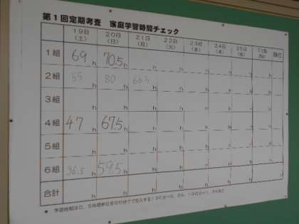 2年生は、テスト期間の家庭学習時間の調査を行っています。各クラス全員の合計を掲示板に書いています。さて、今週末はいよいよ定期テスト本番!授業も、そして家庭学習もしっかり取り組んでいきましょう。