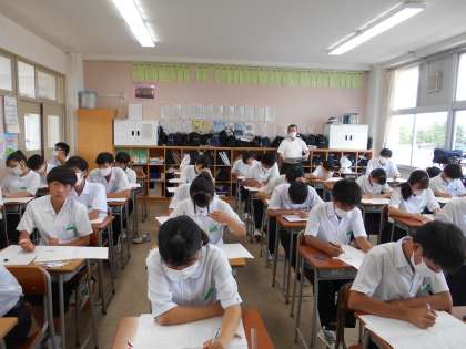 7月9日(金) 3年生は実力テスト2日目です。50分、時間いっぱいまであきらめずに問題に向かっています。