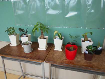 3年生の教室前には、観葉植物がずらりとならんでいます。
