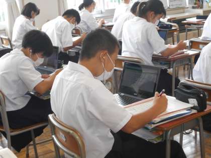 授業風景〜1年生〜 公開日 2021/07/12 更新日 2021/07/12 山室中学校のページ 7月12日(月) 【1年3組:英語】 アビゲイルさんとスピーキングテストです。元気よく質問に答えています。 【1年6組:英語】 教科書の内容を理解するために、各自で学習を進めます。クロームブックで音声を聞く生徒、友達に教えてもらう生徒、学び方は色々です。