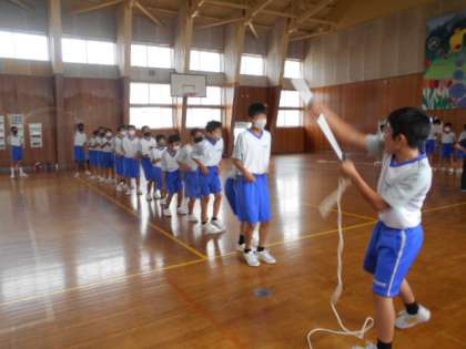 1年学年レクリエーション 公開日 2021/07/16 更新日 2021/07/16 1学年 7月16日(金) 第2体育館では長縄跳びに挑戦中。縄の回し方を工夫したり、かけ声を掛けたり、どうやったら回数を跳べるか模索中です。