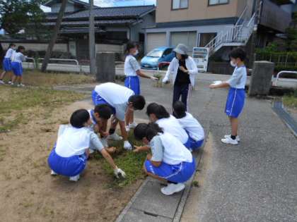 環境整備活動〜チーム1年5組〜 公開日 2021/07/16 更新日 2021/07/16 山室中学校のページ 7月16日(金) 1年5組は、ソフトボール部のバックネット付近の草むしりを中心に行いました。友達や先生とお話ししながらも熱心に活動しました。