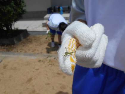 草むしりの途中でかまきりの赤ちゃんを発見したと生徒が見せてくれました。(写真下)