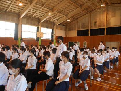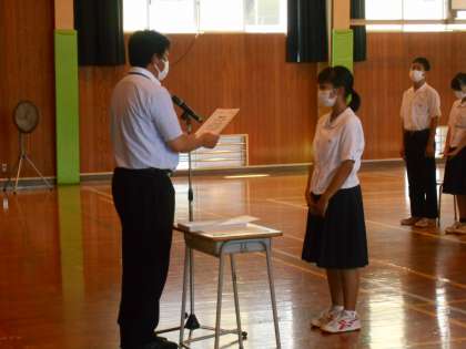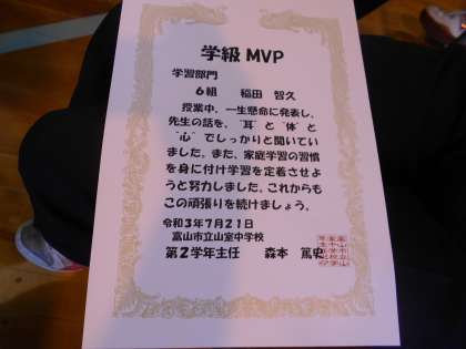2学年集会その1 公開日 2021/07/20 更新日 2021/07/20 山室中学校のページ 7月20日(火) 2年生はまず、学級MVPを紹介しました。給食、部活動、挨拶、生活等の6部門で頑張った生徒達が紹介されます。みんなにっこり嬉しそうです。学年主任より、賞状が渡されました。