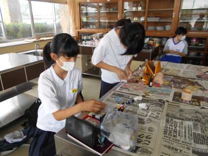 夏休みの部活動〜家庭科部〜 公開日 2021/07/26 更新日 2021/07/26 山室中学校のページ 7月26日(月) エアコンが効かない家庭科室で、黙々と作品作りをしているのは、家庭科部のみなさんです。フェルトマスコット、レジンでペンダントヘッドづくり、ミサンガづくりなど、思い思いの作品を作っています。