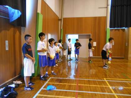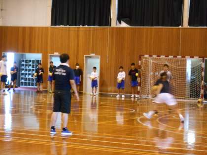 ハンドボール部は、男女一緒に活動しています。顧問の先生も入って、速攻の練習です。体育館の端から端までダッシュしながら球を回します。速い、速い!