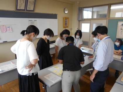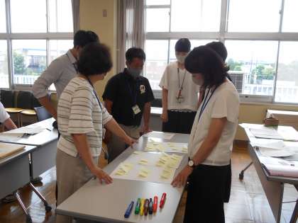 先生達の熱い夏期研修会〜3年生編〜 公開日 2021/07/26 更新日 2021/07/26 山室中学校のページ 7月26日(月) 3年生のアンケートQ−Uでは、K13法という分析方法で、付箋に意見を書き、グループ分けしながら話し合っています。色々な先生の見方から、自分の学級に生かせそうなヒントがたくさん出てきました。