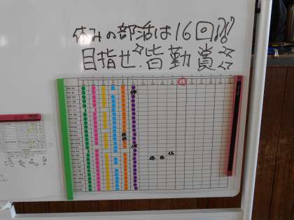 8月2日(月) ホワイトボードには、この夏休みの出欠表が!目指せ!皆勤賞。