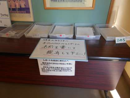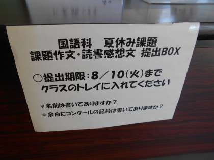 夏休みの課題提出 公開日 2021/08/05 更新日 2021/08/05 山室中学校のページ 8月5日(木) 職員室前には、オープンハイスクールのレポート、国語の応募作文等の提出ボックスが並んでいます。夏休みの課題はみなさん順調に進んでいますか?