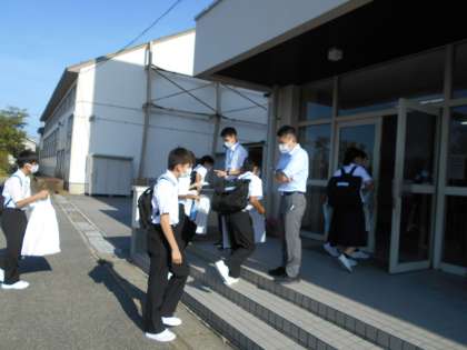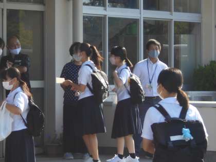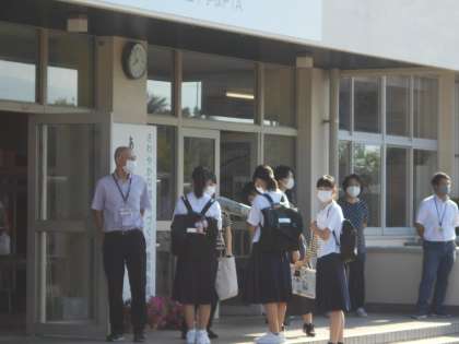 登校風景 公開日 2021/08/27 更新日 2021/08/27 山室中学校のページ 8月27日(金) 久々に校舎内に「おはようございます!」と生徒の元気な声が響きます。たくさんの宿題を抱えての登校です。