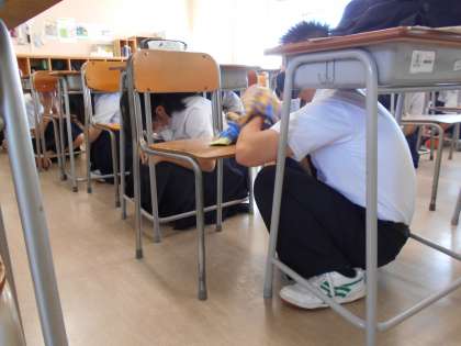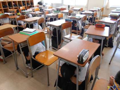 シェイクアウト訓練を行いました。訓練では、「DROP:まず低く」「COVER:頭を守り」「HOLD ON:動かない」の3つを意識して実施しました。